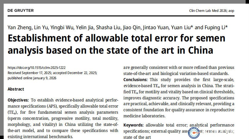 近日,四川大学华西第二医院生殖男科/四川省人类精子库(华西精液检测质量控制中心)郑艳为第一作者,李福平、刘源为通讯作者的研究成果《Establishment of allowable total error for semen analysis based on the state of the art in China》在期刊《Clinical Chemistry and Laboratory Medicine》正式发表。